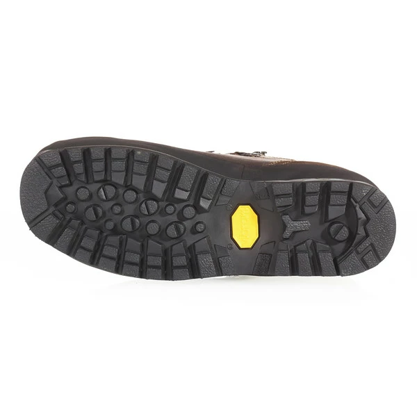 Die Sohlenkonstruktion dämpft und stabilisiert gleichermaßen. Das Profil der Gummilaufsohle sorgt für Trittsicherheit und Halt. Geschlossen wird der Stiefel mit einer weit vorn angesetzten Schnürung, die durch Metallösen- und Haken läuft. Durch den Derby-Schnitt und die verhältnismäßig kurz gearbeitete Zunge lässt sich der Stiefel in der Passform optimal verändern. So ist der Watzmann auch für Trekker mit hohem Spann bestens geeignet.